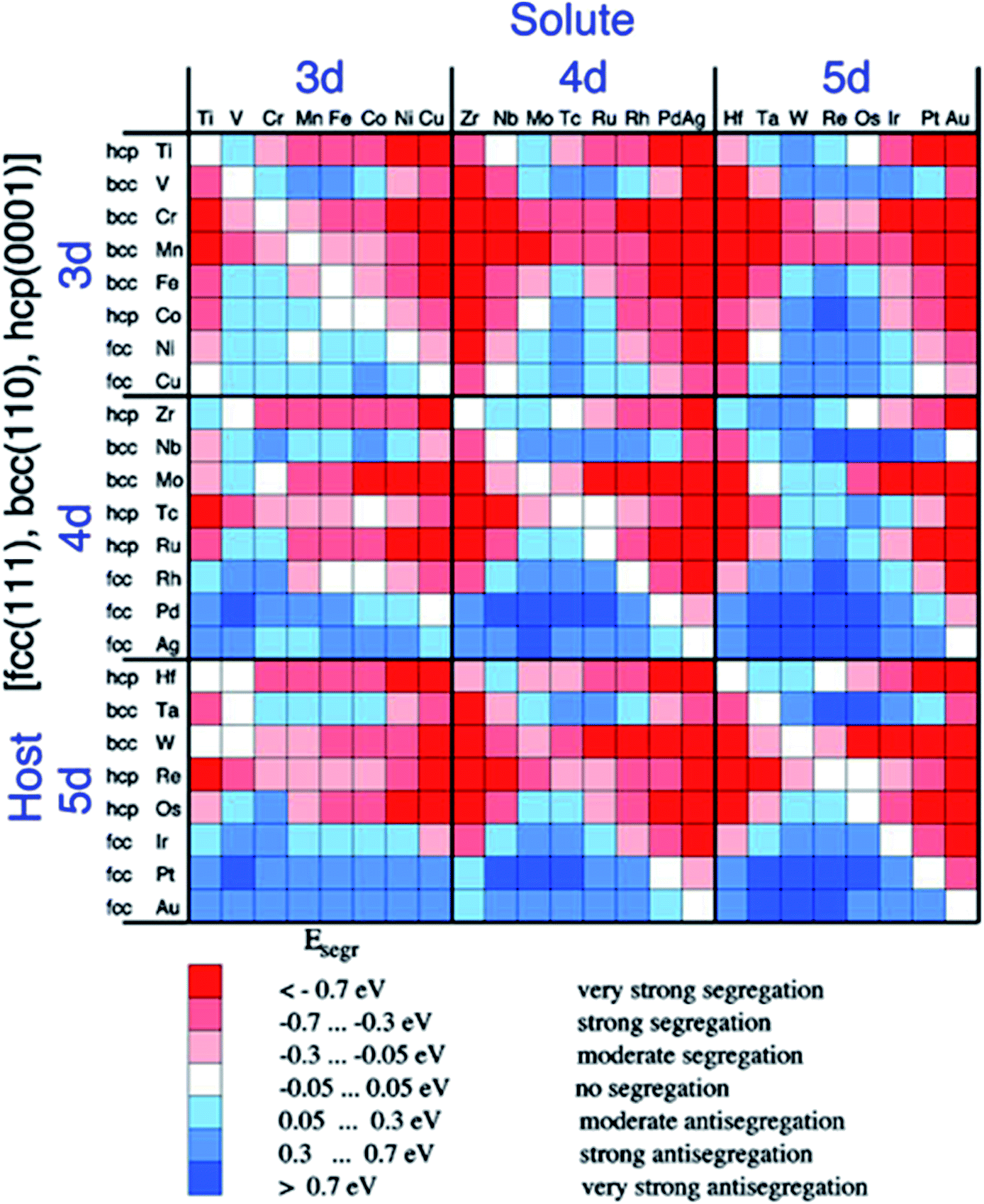 | Fig. 1 Surface segregation energies of metal impurities for the close-packed surfaces of metals. Reproduced with permission.33 Copyright 1999, The American Physical Society. | ||