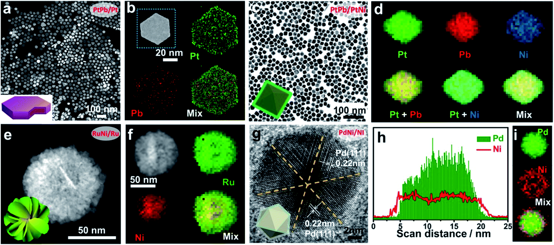 | Fig. 2 Typical examples of core/shell structures synthesized via the one-step strategy. (a and b) STEM image and EDS mapping of PtPb/Pt nanoplates. (c and d) TEM image and EDS mapping of PtPb/PtNi octahedra. (e and f) STEM image and EDS mapping of a RuNi/Ru 2D nanosheet assembly. (g–i) HRTEM, EDS line-mapping and EDS mapping of PbNi/Ni icosahedra. (a and b) Reproduced with permission.35 Copyright 2016, American Association for the Advancement of Science. (c and d) Reproduced with permission.39 Copyright 2017, American Chemical Society. (e and f) Reproduced with permission.36 Copyright 2019, Elsevier Ltd. (g–i) Reproduced with permission.37 Copyright 2018, American Association for the Advancement of Science. | ||