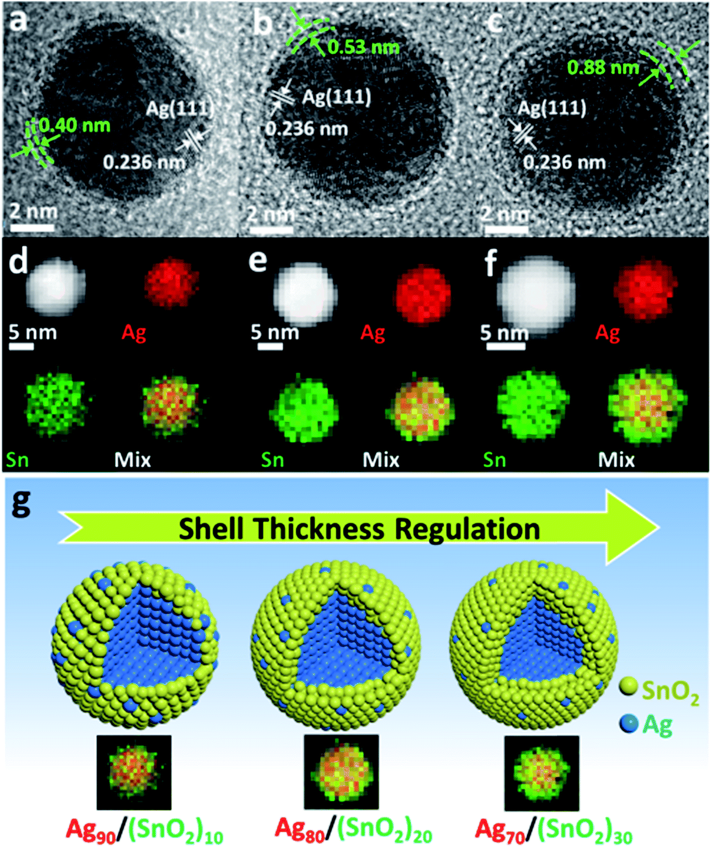 | Fig. 3 (a–c) TEM images and (d–f) TEM-EDX mapping images of Ag/SnO2 core/shell nanoparticles with tunable thickness. (g) The scheme of shell thickness regulation in Ag/SnO2 core/shell system via a one-step strategy. Unpublished result.41 | ||