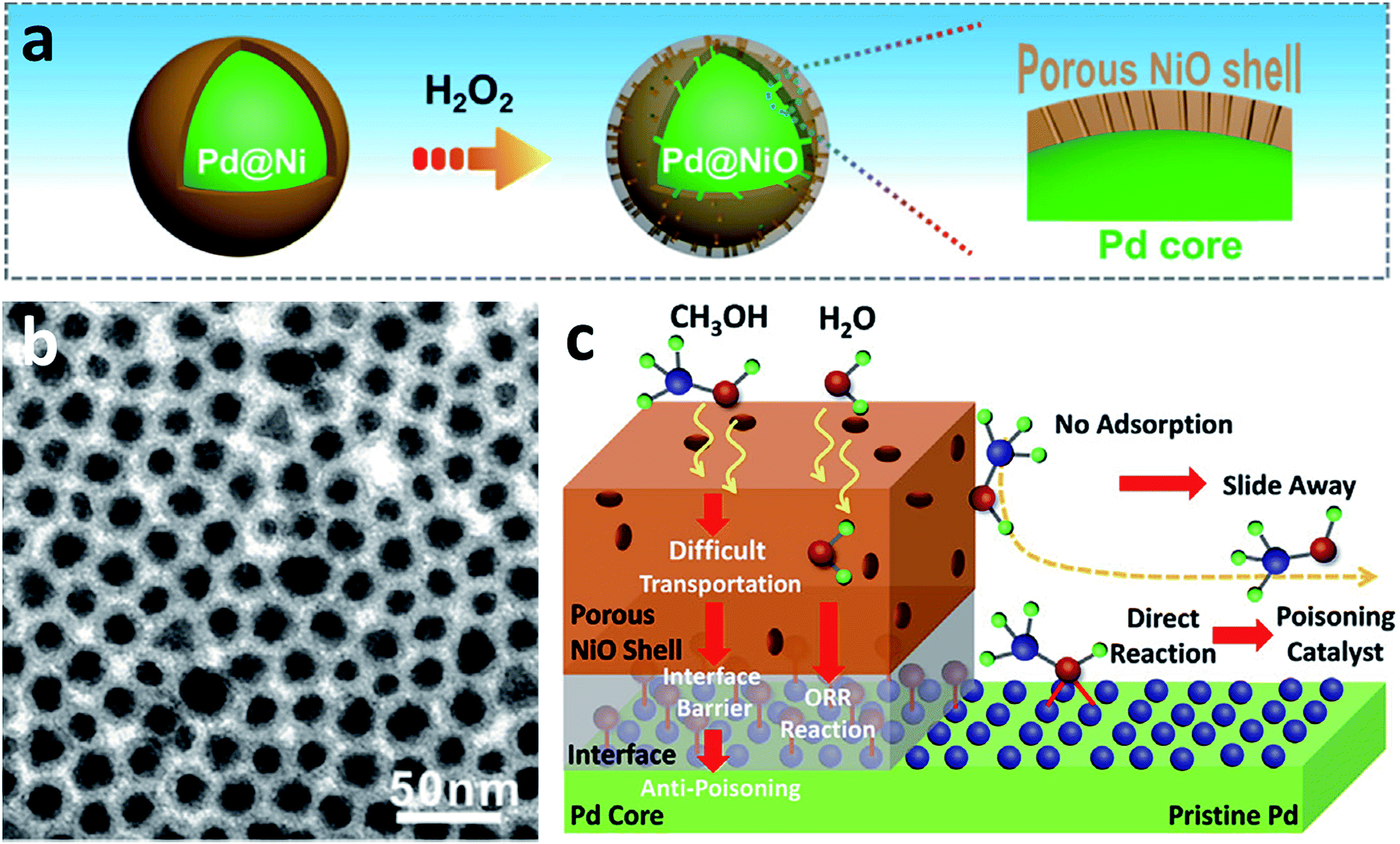 | Fig. 4 (a) Schematic illustration of the preparation of the Pd/NiO core/shell structure. (b) TEM image of the Pd/NiO core/shell structure. (c) Schematic illustration of the important role of open channels and interfaces in the catalytic reaction. Reproduced with permission.55 Copyright 2019, Elsevier Ltd. | ||