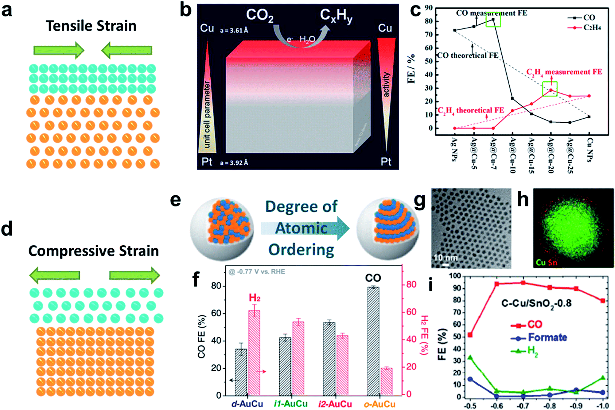 | Fig. 5 The CO2RR performance of catalysts via strain engineering. (a and d) Schematic illustration of the tensile and compressive strain effect. (b) Scheme of the CO2RR on the Cu/Pt core/shell structure. Reproduced with permission.92 Copyright 2013, American Chemical Society. (c) CO2RR activities on Ag/Cu catalysts with different Cu shell thicknesses. Reproduced with permission.94 Copyright 2017, American Chemical Society. (e and f) CO2RR performance comparison on AuCu catalysts with different atomic orders. Reproduced with permission.56 Copyright 2017, American Chemical Society. (g–i) CO2RR performance obtained by using Ag/SnO2 with the optimized SnO2 shell. Reproduced with permission.54 Copyright 2017, American Chemical Society. | ||