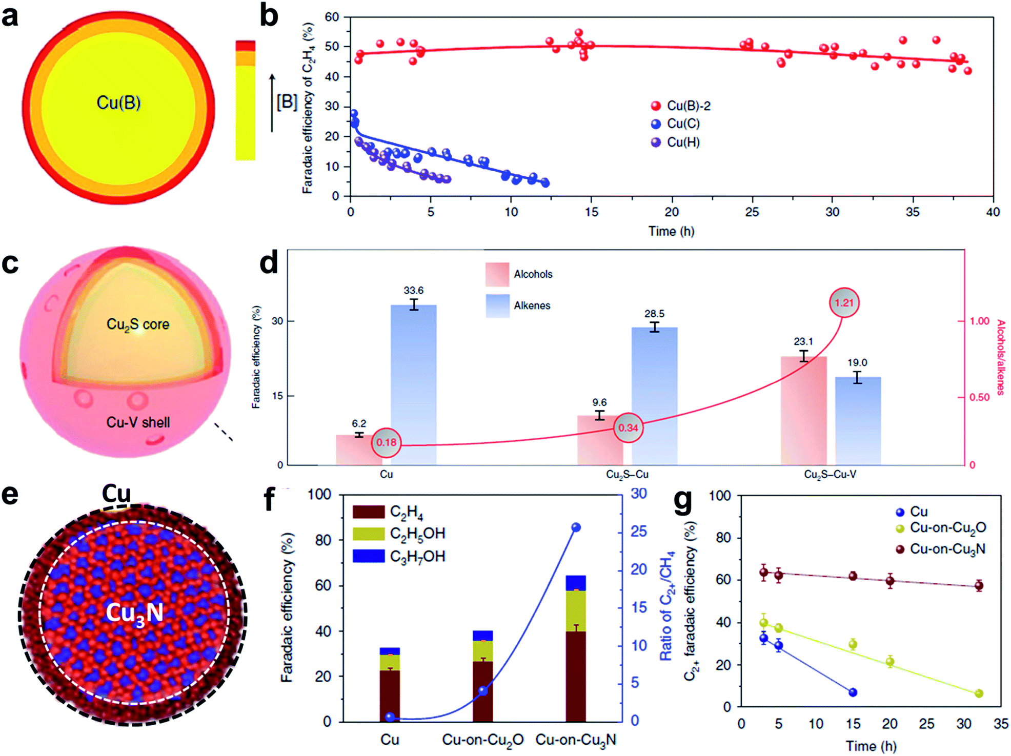 | Fig. 6 CO2RR performance of the catalysts via the surface engineering strategy. (a and b) Surface doping engineering of Cu/B doped Cu core/shell catalysts for the CO2RR, exhibiting high FE to C2 hydrocarbons. Reproduced with permission.42 Copyright 2018, Nature Publishing Group. (c and d) Surface defect engineering of a Cu2S/Cu vacancy core/shell catalyst for the CO2RR, which achieves higher FE to alcohols than to alkenes. Reproduced with permission.43 Copyright 2018, Nature Publishing Group. (e–g) Surface phase engineering of a Cu3N/Cu core/shell catalyst for the CO2RR, exhibiting high selectivity to C2+ production and long-term stability. Reproduced with permission.102 Copyright 2018, Nature Publishing Group. | ||