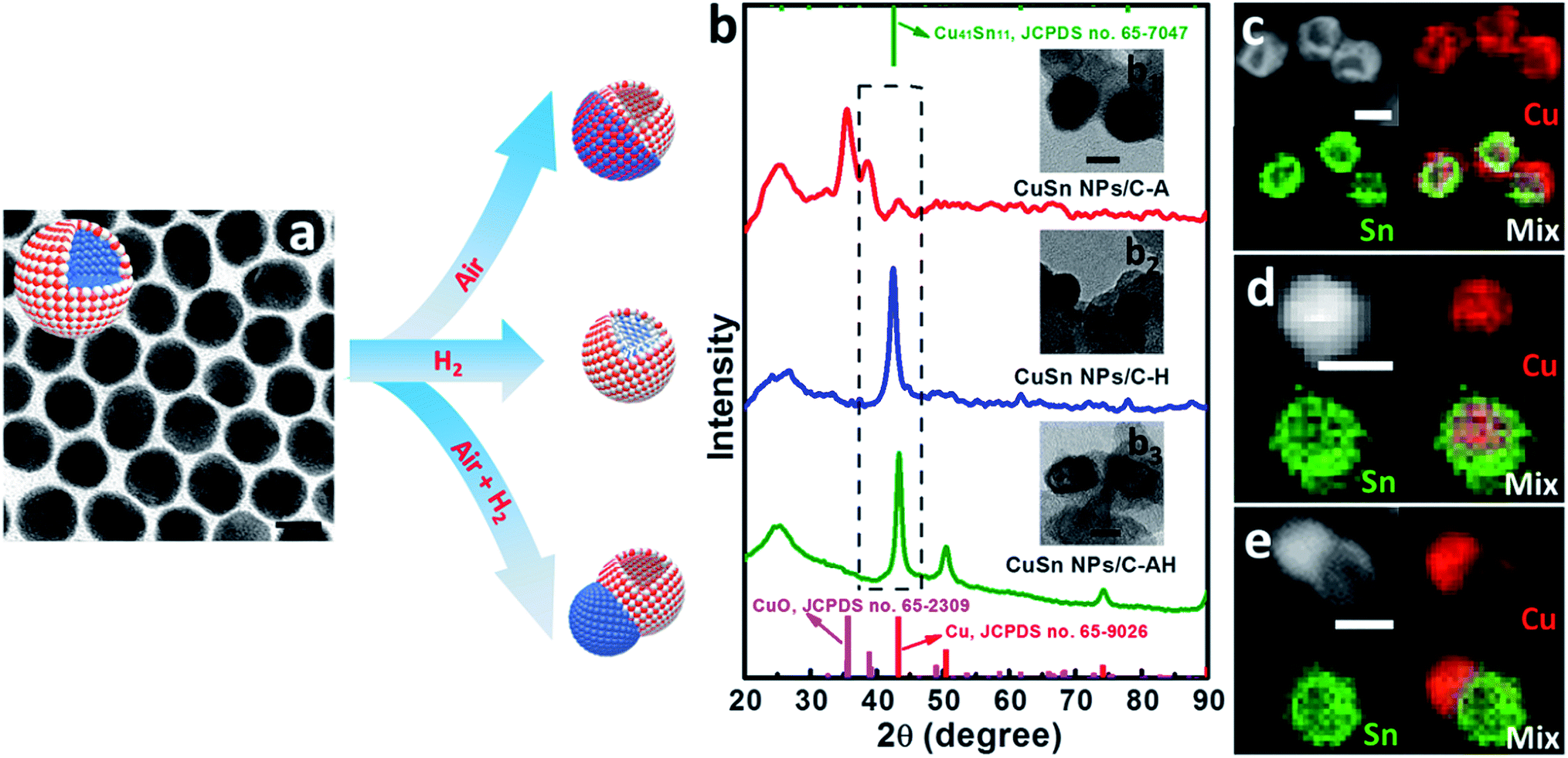 | Fig. 7 Phase and structural evolution of Cu/SnO2 core/shell NPs. (a) The TEM image of the initial Cu/SnO2 core/shell NPs. (b) XRD summary of the CuO/hollow SnO2 heterostructure, Cu41Sn11@SnO2 core/shell structure and Cu/hollow SnO2 Janus structure, obtained under different annealing conditions. TEM images and EDS mapping results of (b1 and c) the CuO/hollow SnO2 heterostructure, (b2 and d) Cu41Sn11@SnO2 core/shell structure and (b3 and e) Cu/hollow SnO2 Janus structure. Reproduced with permission.40 Copyright 2018, Nature Publishing Group. | ||