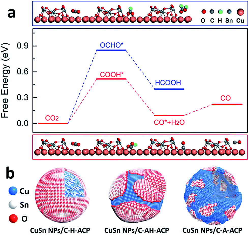 | Fig. 8 (a) Free energy profiles of two pathways for CO2 electroreduction on Cu/SnO2 interfaces. The upper and lower images are optimized geometric structures of various states (COOH*, OCHO*, and CO*) of the process on Cu/SnO2 interfaces, respectively. H, C, O, Cu, and Sn atoms are represented by green, gray, red, reddish brown, and dark gray spheres, respectively. (b) The models of CuSn NPs/C-A-ACP, CuSn NPs/C-H-ACP, and CuSn NPs/C-AH-ACP with different Cu/SnO2 interfaces. Reproduced with permission.40 Copyright 2018, Nature Publishing Group. | ||
