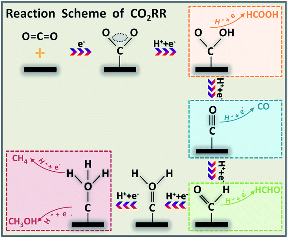 Based on eqn (1)–(5), the C1 reaction products, CO, HCOOH, HCHO, CH3OH, and CH4, are produced via 2, 4, 6 and 8 electron pathways.65 Various metals have been reported to be CO2RR-active materials.66 The preferred product of In, Sn, Pb, Bi and their oxides is HCOOH.67–71 This is due to the fact that In, Sn, Pb, Bi and their oxides have a dominant p-electron distribution, which leads to a strong adsorption of CO2˙− and largely prevents further reduction of CO2˙−.61 Au, Ag and Pd have low ability to adsorb the CO intermediate, thus leading to the easy generation of CO.72–74 In addition, due to the moderate binding energies of different intermediates, Cu is the only metal that can produce various reaction products (e.g. CH4, C2H5OH, C2H4, and C3H7OH), while its selectivity toward a certain product is quite poor.75–77